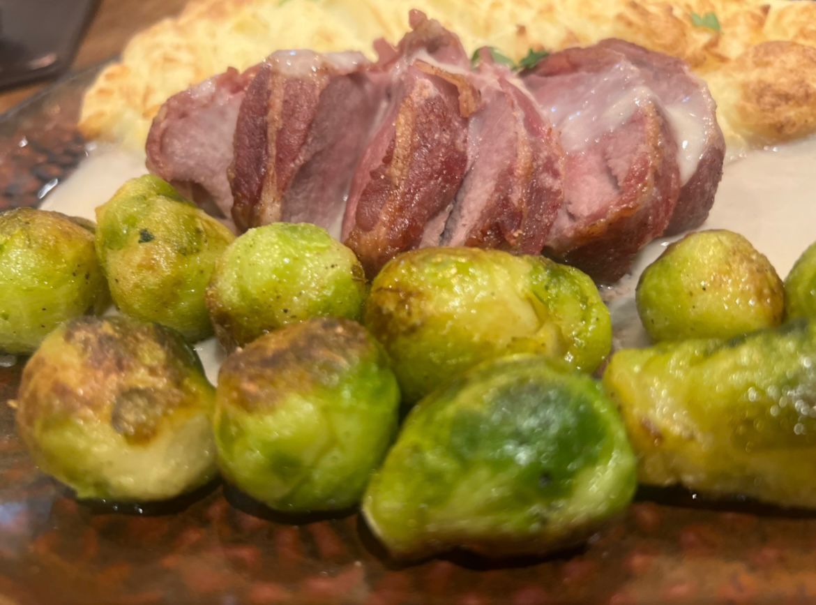 mit Rosenkohl und Kartoffelpüree