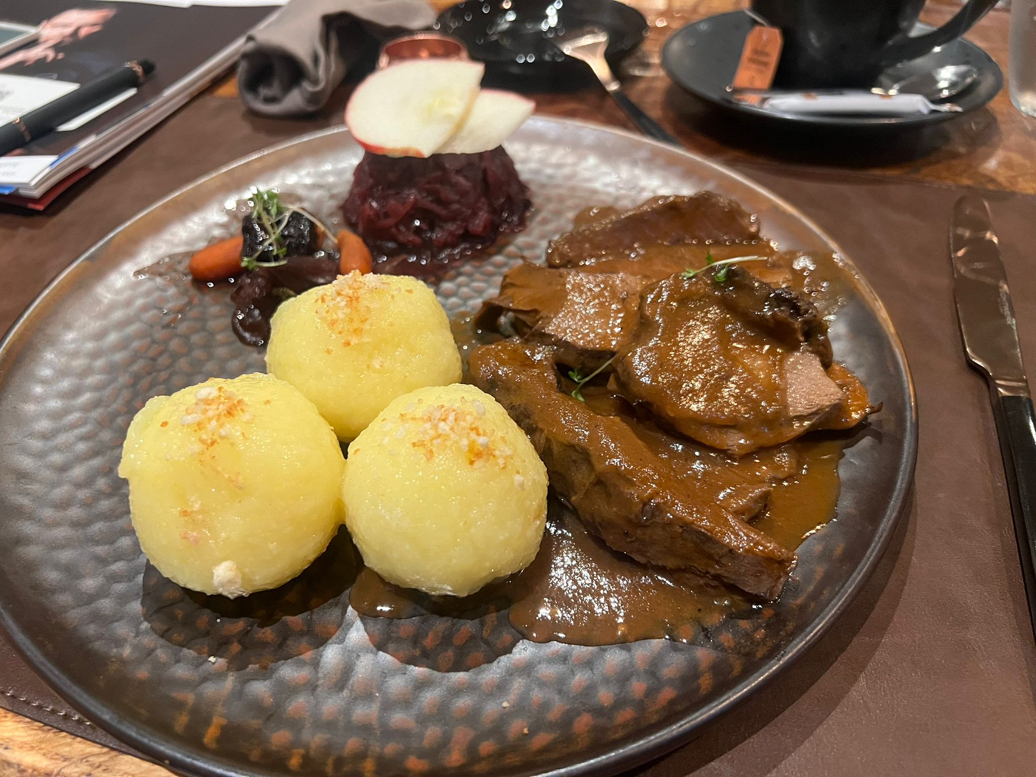 mit Apfelrotkohl und Kartoffelknödel.